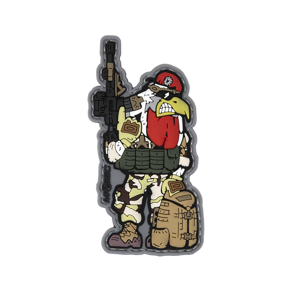 Nous avons souhaité mettre à l'honneur les membres de l'équipe, anciens de la 11 BP, ainsi que nos clients historiques et amis. Le coq est le symbole national français, il porte le béret rouge des parachutistes, il est armé du HK 416 et il est équipé des produits phares de nos marques : un sac de combat Mystery Ranch, une tenue Arktis, le gilet Tac-Tec 5.11, une paire de gants et des lunettes Oakley et une paire de chaussures LOWA Zéphyr.