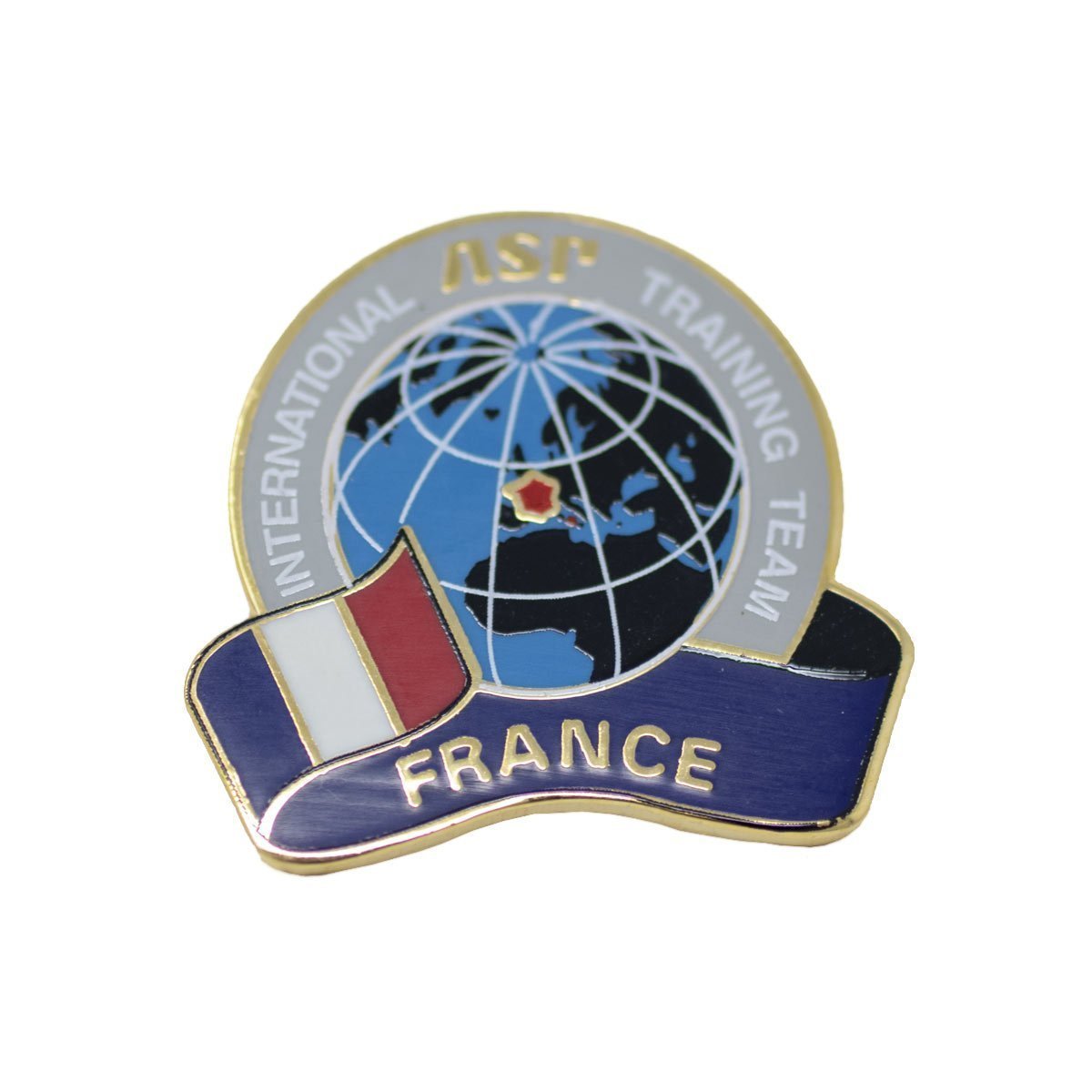Le pin's International Trainer Team d'ASP spécial France. Il représente le globe terrestre avec la France mise en évidence en rouge avec contour dorée, ainsi que le drapeau français. 2 cm de diamètre.