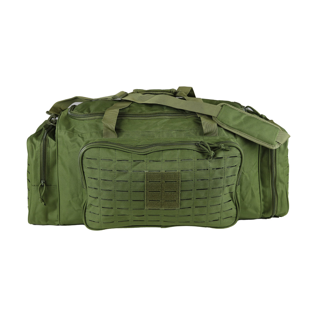 Sac de transport de couleur vert olive pour tous vos déplacements. Il possède une poche latérale pour y ranger des chaussures, ce qui évite de salir les autres affaires du sac. Il est équipé de nombreux passants MOLLE sur les poches latérales et frontale pour augmenter la capacité d'emport avec l'ajout de poches supplémentaires compatibles MOLLE. Il se porte par les anses ou à l'épaule avec la bandoulière amovible.